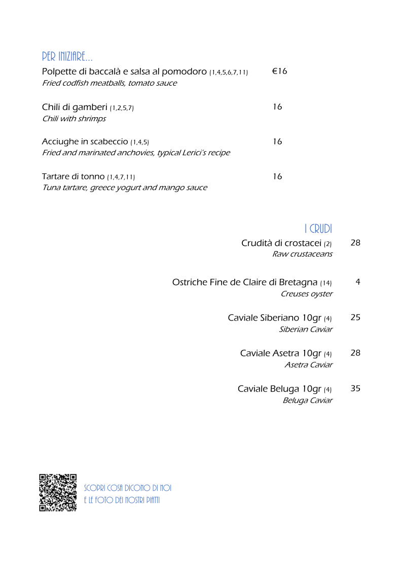 Moving on to the raw selections, or "I CRUDI", you will find some of the finest offerings in Italian seafood. The Crudità di crostacei (raw shellfish) showcases the freshest local catch, while the Ostriche Fine de Claire di Bretagna (Fine de Claire oysters from Brittany) are a perfect choice for oyster aficionados. For a more indulgent touch, the Caviale Siberiano 10gr (Siberian caviar), Caviale Asetra 10gr (Asetra caviar), and Caviale Beluga 10gr (Beluga caviar) provide a luxurious experience, with each caviar variety offering its own unique and refined taste.