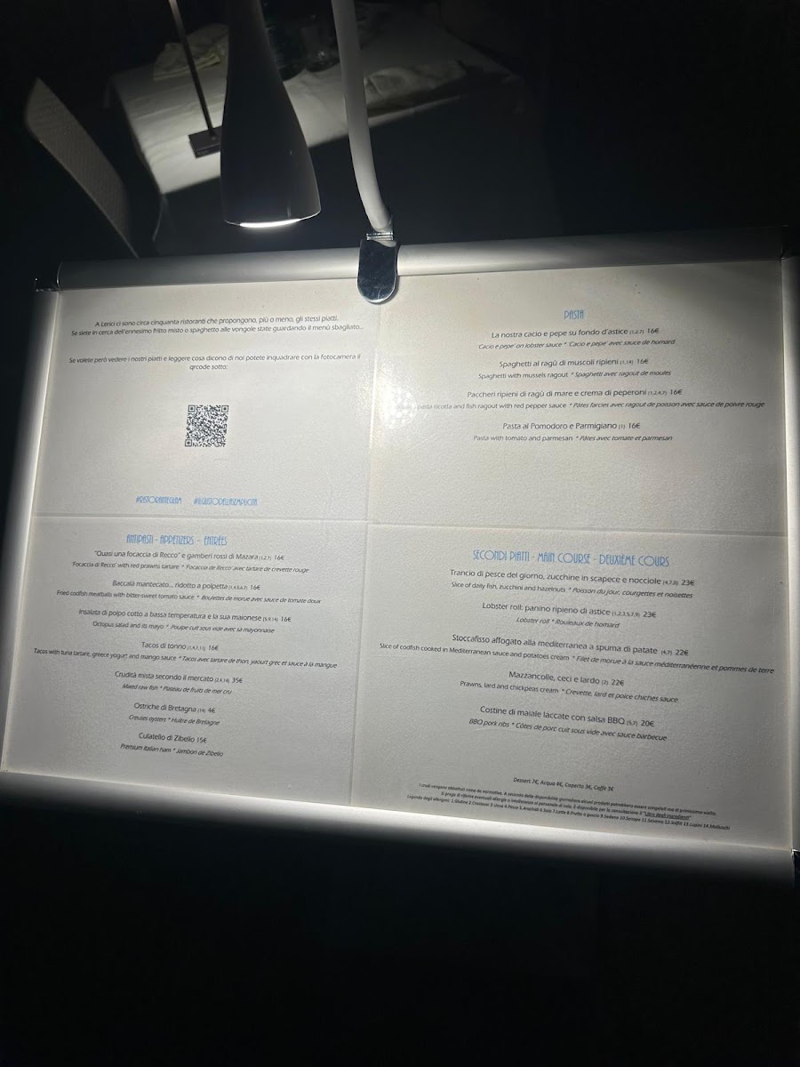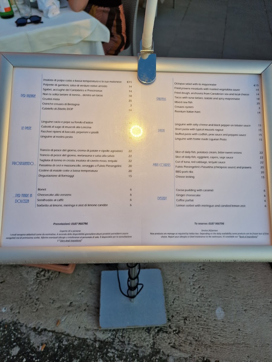 For the pasta lovers, "LE PASTE" section has a selection of dishes that will surely impress. The Cacio e pepe su fondo d'astice (cacio e pepe with lobster base) is a rich, creamy option, while the Spaghetti con calamari, vongole e bottarga (spaghetti with squid, clams, and bottarga) brings a burst of seafood flavors. For something lighter, the Trofie al ragù di pesce, aglio dolce e basilico (trofie pasta with fish ragù, sweet garlic, and basil) is an excellent choice. If you prefer a traditional Ligurian flavor, the Trofie al pesto di nostra produzione (trofie pasta with homemade pesto) is a must-try.